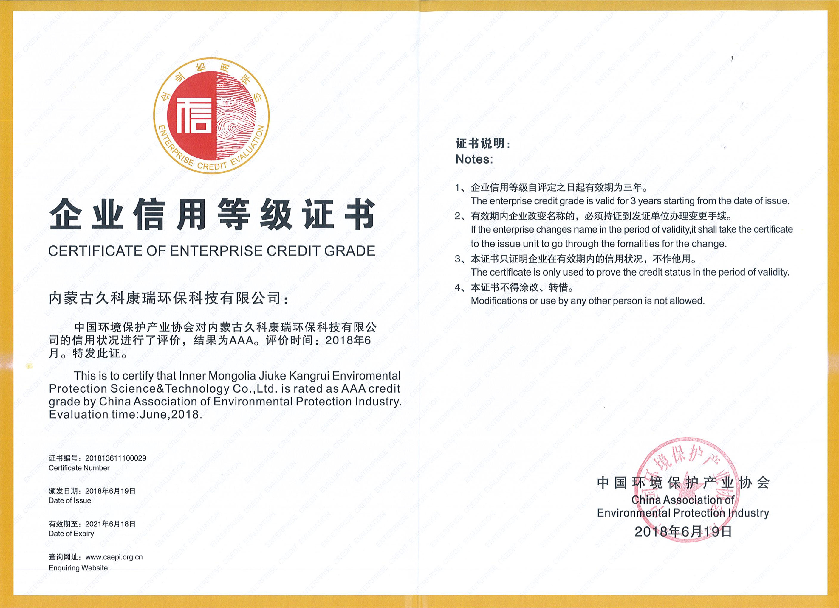 久科環保獲得第十批中國環境保護產業行業企業信用評價最高等級,標志著我司具有優秀的信用紀錄,經營狀況佳,盈利能力強,發展前景廣闊,在整個環保細分領域有一定的影響力。