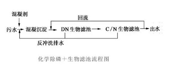 該工藝優(yōu)點(diǎn)是工藝流程簡(jiǎn)單,控制方便;但藥劑耗量較大,剩余污泥較多,同時(shí)由于混凝沉淀去除一部分有機(jī)物,有可能引起后續(xù)反硝化碳源不足。另外一種是同步沉淀與絮凝過(guò)濾,即在曝氣生物濾池中投加化學(xué)藥劑,沉淀物積聚在填料中,通過(guò)周期性反沖洗,將磷排出系統(tǒng)外,達(dá)到除磷的目的,該工藝藥劑量相對(duì)較小,但是污泥被截留在曝氣生物濾池內(nèi),會(huì)縮短生物濾池的運(yùn)行周期,增加反沖洗的頻率。